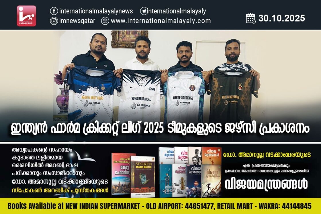ദോഹ: ഖത്തറിലെ വിവിധ മേഖലകളില് ജോലി ചെയ്യുന്ന ഇന്ത്യന് ഫാര്മസിസ്റ്റുമാരുടെ കൂട്ടായ്മയായ ഇന്ത്യന് ഫാര്മസിസ്റ്റ് അസോസിയേഷന് ഖത്തര് സംഘടിപ്പിക്കുന്ന ഇന്ത്യന് ഫാര്മ ക്രിക്കറ്റ് ലീഗ് 2025-ല് പങ്കെടുക്കുന്ന ടീമുകളുടെ ജഴ്സി പ്രകാശനം ബിന് ഒമ്രാന് അരീഫ് റെസിഡന്സില് വച്ച് നടന്നു.