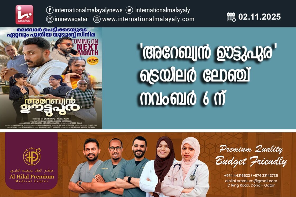 ദോഹ. ഖത്തറിലും നാട്ടിലുമായി പൂര്ണമായും മൊബൈല് ഫോണില് ചിത്രീകരിച്ച ആദ്യ മലയാള സിനിമയായ അറേബ്യന് ഊട്ടു പുര ട്രെയിലര് ലോഞ്ച് നവംബര് 6 ന് ബര്വ മദീനത്നയിലെ ഡൈനാമിക് ഹാളില് നടക്കും. പ്രശസ്ത സിനിമാതാരം ഹരീഷ് ചന്ദ്ര വര്മ്മയാണ് ട്രെയിലര് ലോഞ്ച് ചെയ്യുന്നത്.
