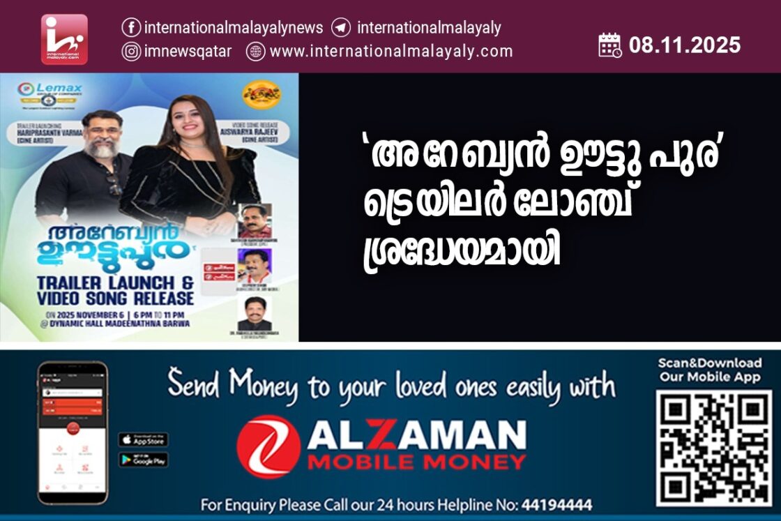 ദോഹ. ഖത്തറിലും നാട്ടിലുമായി പൂര്ണമായും മൊബൈല് ഫോണില് ചിത്രീകരിച്ച ആദ്യ മലയാള സിനിമയായ അറേബ്യന് ഊട്ടു പുര ട്രെയിലര് ലോഞ്ച് ശ്രദ്ധേയമായി . പ്രശസ്ത സിനിമാതാരം ഹരീഷ് ചന്ദ്ര വര്മ്മയാണ് ടഎായിലര് ലോഞ്ച് ചെയ്തത്. ഖത്തറിലെ എല്ലാ പരിമിതികളിലും നിന്ന് മനോഹരമായ ഒരു ചിത്രം അണിയിച്ചൊരുക്കിയ അറേബ്യന് ഊട്ടുപുര ടീമിനെ അഭിനന്ദിച്ച അദ്ദേഹം സിനിമയുടെ ലോഞ്ചിംഗ് ഒരു തിയേറ്ററില് തന്നെ നടത്തണമെന്നും കൂടുതല് നല്ല സിനിമകള്ക്കായി പരിശ്രമിക്കണമെന്നും അഭിപ്രായപ്പെട്ടു. സിനിമ നടി ഐശ്വര്യ രാജീവ് ചിത്രത്തിലെ പാട്ട് റിലീസ് ചെയ്തു.