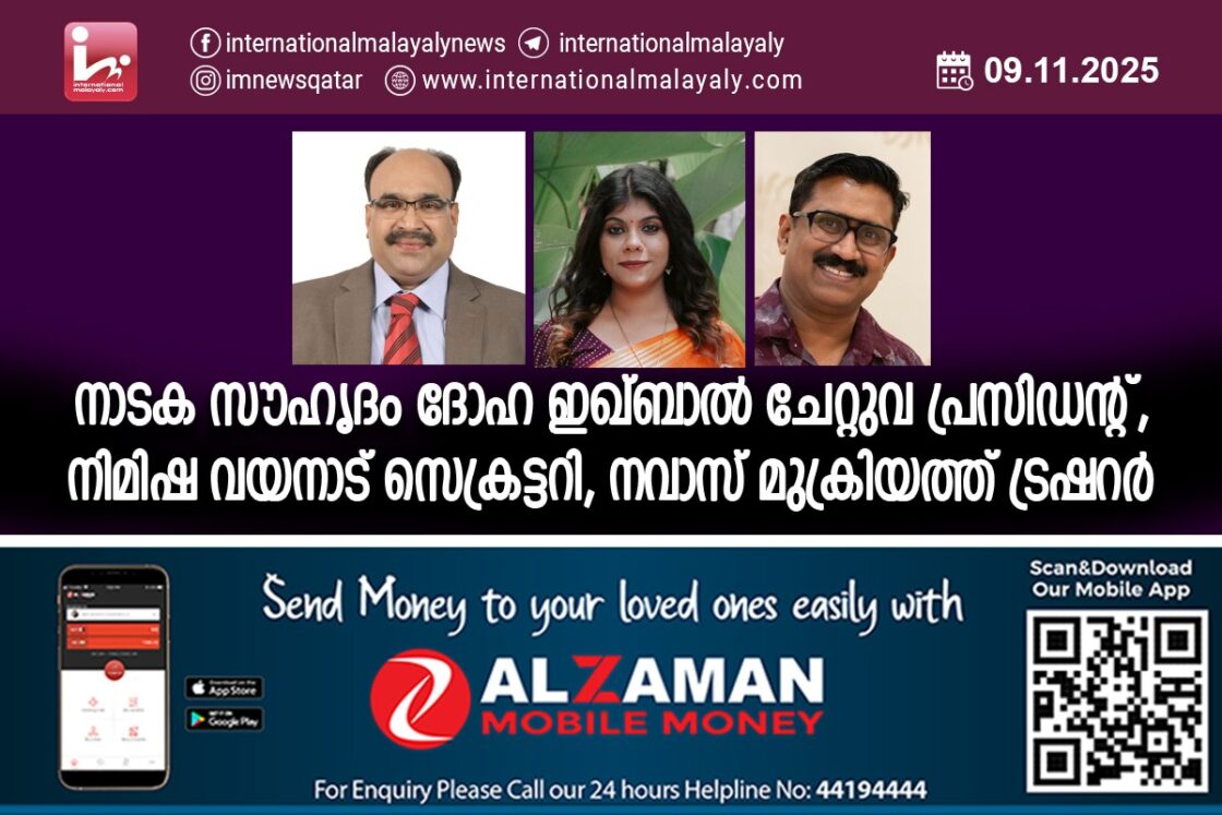 നാടക സൗഹൃദം ദോഹ ഇഖ്ബാല് ചേറ്റുവ പ്രസിഡന്റ്, നിമിഷ വയനാട് സെക്രട്ടറി, നവാസ് മുക്രിയത്ത് ട്രഷറര്