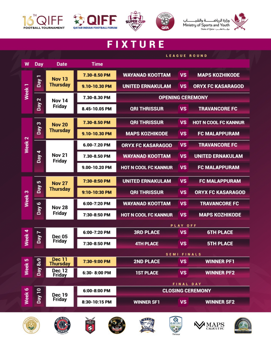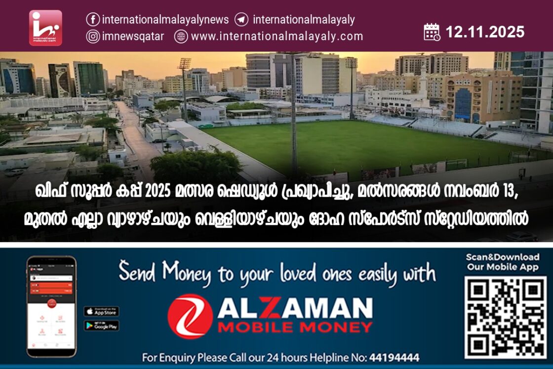 ഖിഫ് സൂപ്പര് കപ്പ് 2025 മത്സര ഷെഡ്യൂള് പ്രഖ്യാപിച്ചു, മല്സരങ്ങള് നവംബര് 13, മുതല് എല്ലാ വ്യാഴാഴ്ചയും വെള്ളിയാഴ്ചയും ദോഹ സ്പോര്ട്സ് സ്റ്റേഡിയത്തില്