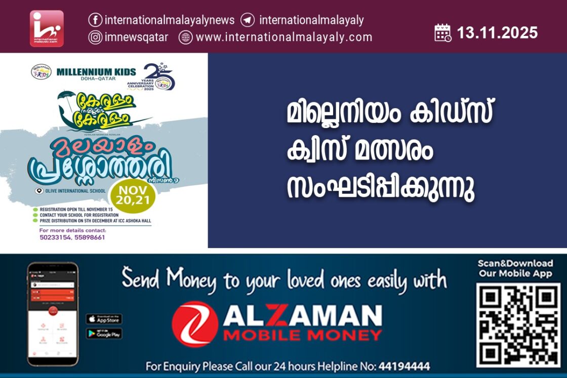 ദോഹ : ഖത്തറിലെ പ്രവാസി മലയാളി കുട്ടികളുടെ സൗഹൃദകൂട്ടായ്മയായ മില്ലെനിയം കിഡ്സിന്റെ ഇരുപത്തഞ്ചാമത് വാര്ഷികആഘോഷങ്ങളുടെഭാഗമായി ”കേരളം നമ്മുടെ കേരളം ‘ എന്ന വിഷയത്തില് ക്വിസ് മത്സരം സംഘടിപ്പിക്കുന്നു. നവംബര് 20, 21 തീയ്യതികളില് ദോഹ ഒലിവ് ഇന്റര്നാഷണല് സ്കൂളില് ആകും പരിപാടി നടക്കുക.