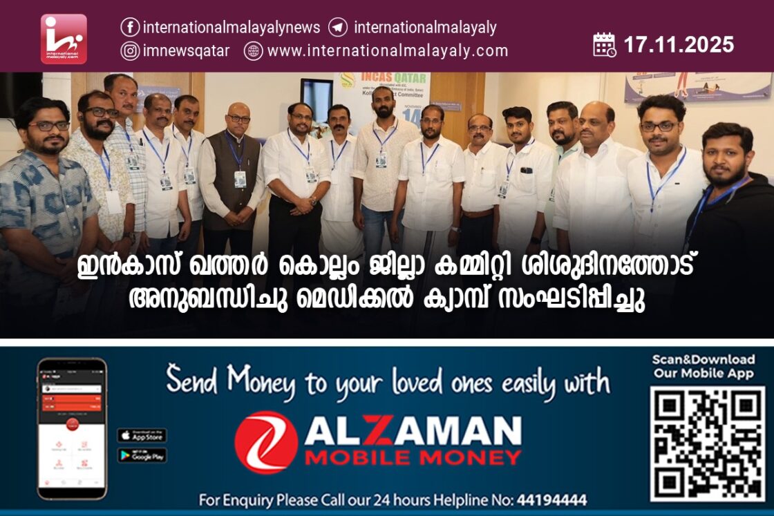 ഇന്കാസ് ഖത്തര് കൊല്ലം ജില്ലാ കമ്മിറ്റി ശിശുദിനത്തോട് അനുബന്ധിച്ച് മെഡിക്കല് ക്യാമ്പ് സംഘടിപ്പിച്ചു