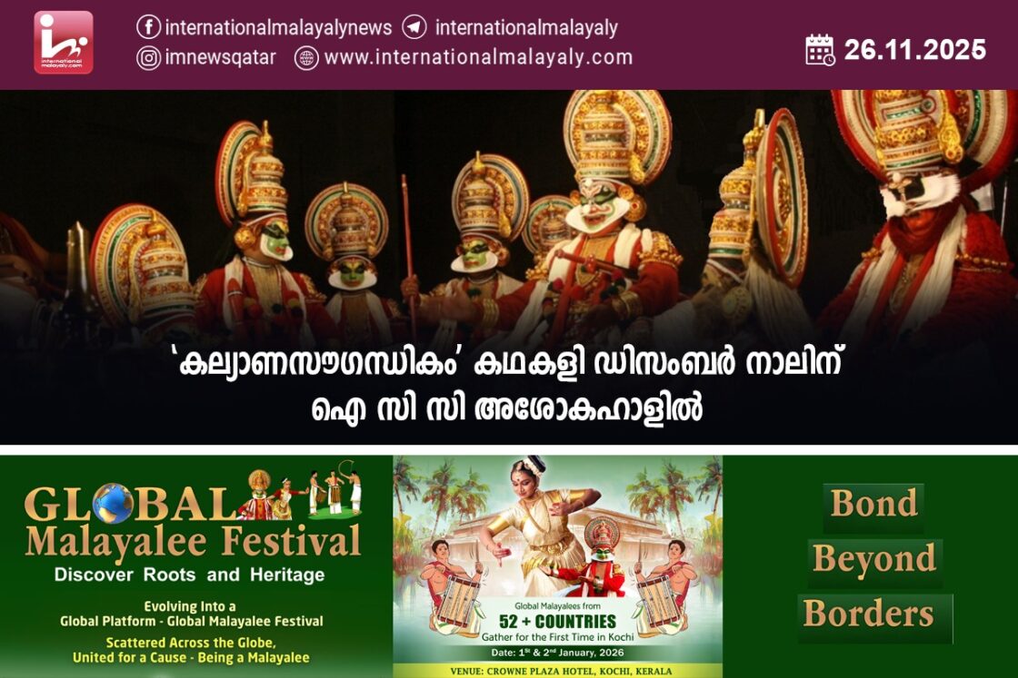 ഡിസംബര് നാലിന് രാത്രി ഏഴു മുതല് ഐസിസി അശോകഹാളില് ആകും ‘കല്യാണ സൗഗന്ധികം ‘ എന്ന കഥയുമായി കഥകളിയില് പ്രാവീണ്യം നേടിയ അങ്കമാലി കഥകളി ക്ലബ്ബിന്റെ പ്രശസ്തരായ പത്തിലേറെ കലാകാരന്മാര് അരങ്ങിലും പിന്നണിയിലുമായി അണിനിരക്കുക.