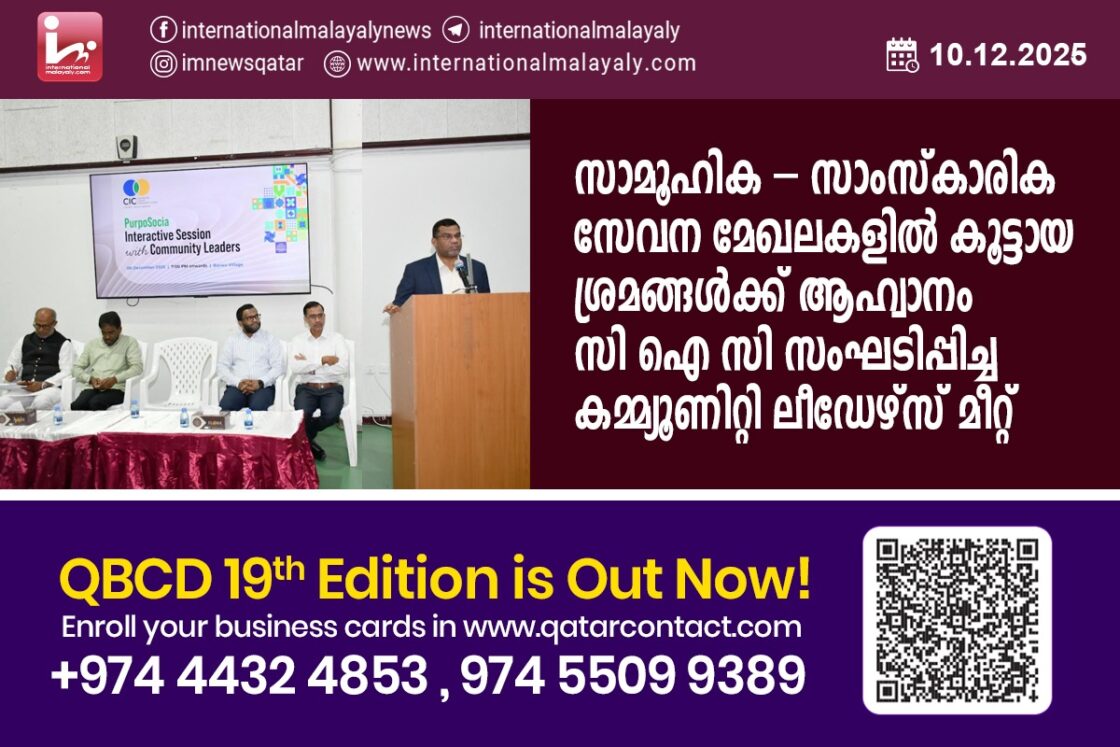 ദോഹ: സമൂഹിക, സാംസ്കാരിക, വിദ്യാഭ്യാസ മേഖലകളിൽ ഖത്തറിലെ പ്രവാസി സംഘടനകൾക്കിടയിൽ കൂട്ടായ പരിശ്രമങ്ങൾ അനിവാര്യമാണെന്ന് സെൻറർ ഫോർ ഇന്ത്യൻ കമ്മ്യൂണിറ്റി (സിഐസി- ഖത്തർ) സംഘടിപ്പിച്ച കമ്മ്യൂണിറ്റി ലീഡേഴ്സ് മീറ്റ് അഭിപ്രായപ്പെട്ടു. വെറുപ്പും വിദ്വേഷവും വളരുന്ന കാലത്ത് സ്നേഹവും സഹോദര്യവും അടിസ്ഥാനപ്പെടുത്തി സാമൂഹിക സഹവാർത്തിത്തം സാധ്യമാക്കാൻ എല്ലാവരും പരിശ്രമിക്കണമെന്ന് മീറ്റ് ആഹ്വാനം ചെയ്തു.