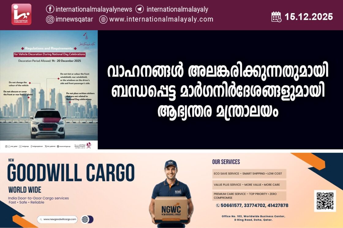 ദോഹ. ഖത്തറില് ദേശീയ ദിനത്തോടനുനുബന്ധിച്ച് വാഹനങ്ങള് അലങ്കരിക്കുന്നതുമായി ബന്ധപ്പെട്ട മാര്ഗനിര്ദേശങ്ങളുമായി ആഭ്യന്തര മന്ത്രാലയം. വാഹനത്തിന്റെ യഥാര്ത്ഥ നിറം മറക്കുന്ന രീതിയിലുള്ള അലങ്കാരങ്ങള് പാടില്ല, മുന്നിലേയും പിന്നിലെയും നമ്പര് പ്ലേറ്റുകള് മറക്കരുത്, മുന്നിലെയും പിന്നിലെയും