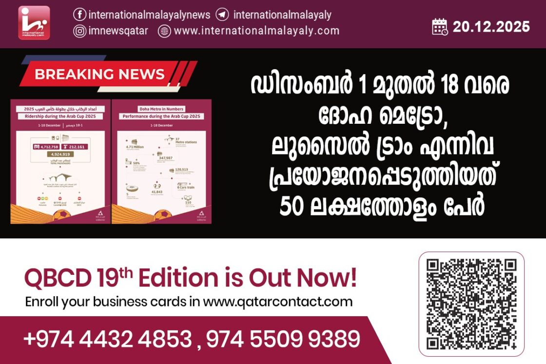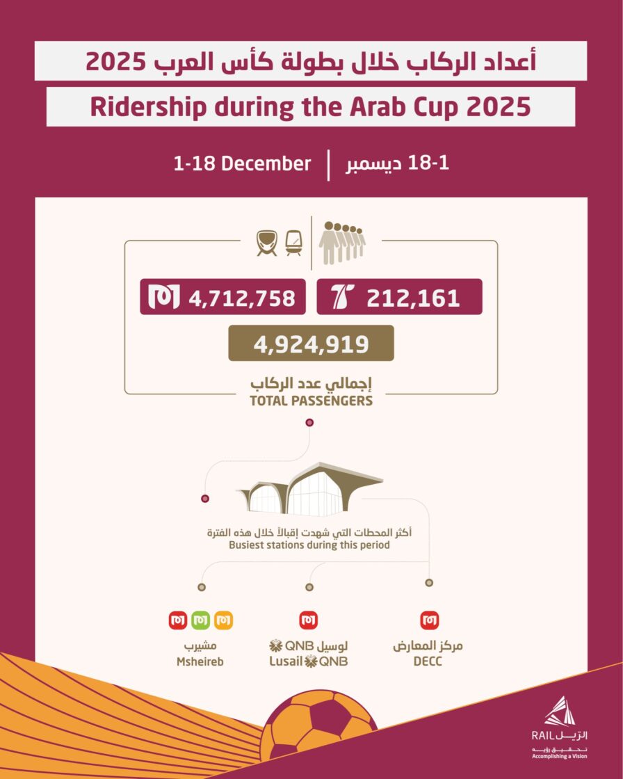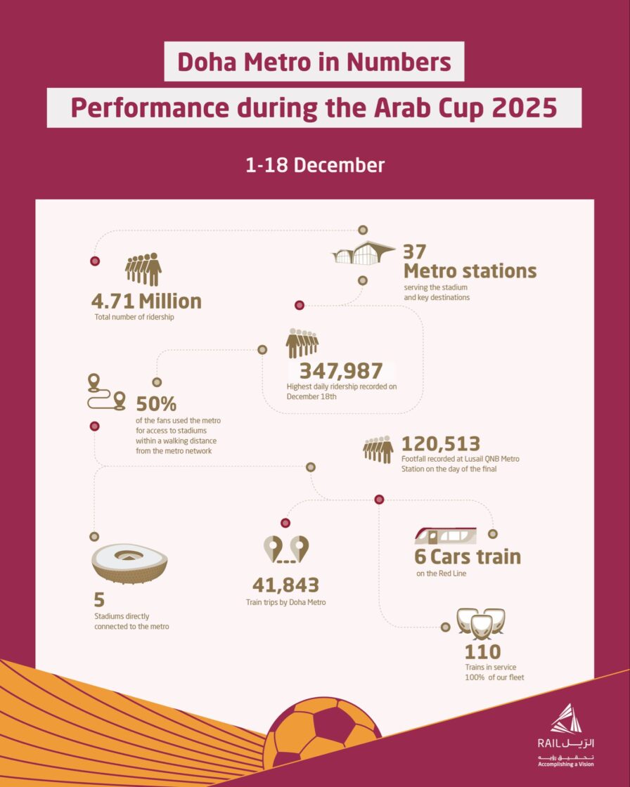 ഖത്തറില്‍ നടന്ന ഫിഫ അറബ് കപ്പ്, ഫിഫ ഇന്റര്‍കോണ്ടിനെന്റല്‍ കപ്പ് ഖത്തര്‍ 2025 ഫൈനലുകള്‍ എന്നിവ കാണാനെത്തിയ ആരാധകര്‍ക്ക് യാത്രാനുഭവം സുഗമമാക്കുന്നതില്‍ ദോഹ മെട്രോ, ലുസൈല്‍ ട്രാം എന്നിവ പ്രധാന പങ്ക് വഹിച്ചു. ഈ കാലയളവില്‍, നെറ്റ്വര്‍ക്കുകള്‍ ആകെ 4,924,919 യാത്രക്കാരെ വഹിച്ചു, ഇതില്‍ 4,712,758 പേര്‍ ദോഹ മെട്രോയും 212,161 യാത്രക്കാര്‍ ലുസൈല്‍ ട്രാമും ഉപയോഗിച്ചു.