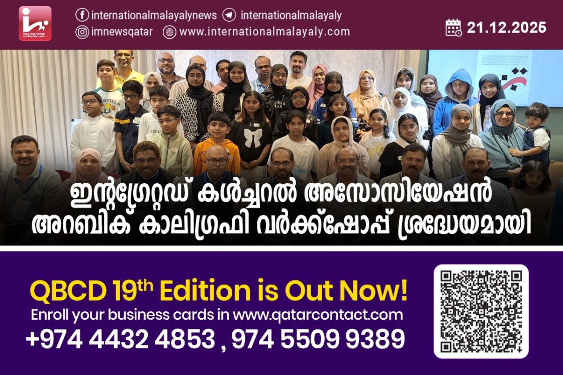 ദോഹ. അന്താരാഷ്ട്ര അറബിക് ദിനാചരണത്തിന്റെ ഭാഗമായി ഇന്റഗ്രേറ്റഡ് കള്ച്ചറല് അസോസിയേഷന് വിദ്യാര്ത്ഥികള്ക്കായി സംഘടിപ്പിച്ച അറബിക് കാലിഗ്രഫി വര്ക്ക്ഷോപ്പ് ശ്രദ്ധേയമായി