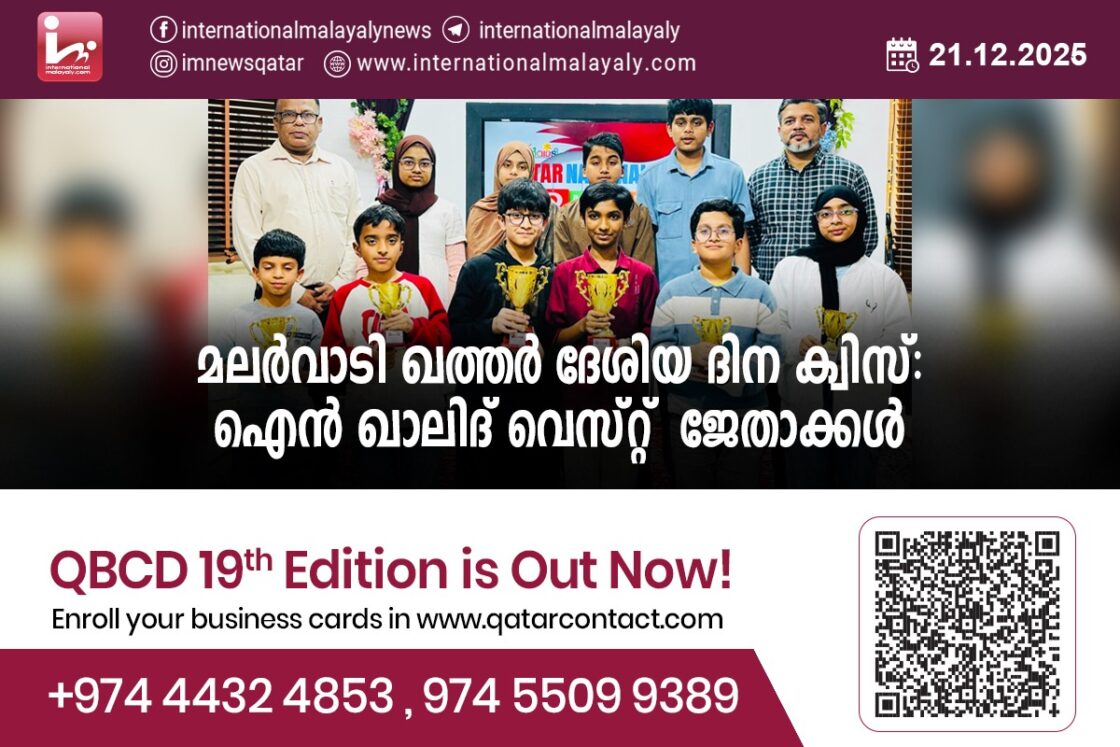 ദോഹ : ഖത്തർ ദേശീയ ദിനത്തോടനുബന്ധിച്ച് മലർവാടി റയ്യാൻ സോൺ പതിമൂന്ന് വയസ്സ് വരെയുള്ള കുട്ടികൾക്ക് വേണ്ടി സംഘടിപ്പിച്ച ക്വിസ് മത്സരത്തിൽ മാസിൻ ബസ്സാം, അഹ്യാൻ ഷഫീഖ് എന്നിവരടങ്ങുന്ന ഐൻ ഖാലിദ് വെസ്റ്റ് ടീം ജേതാക്കളായി.