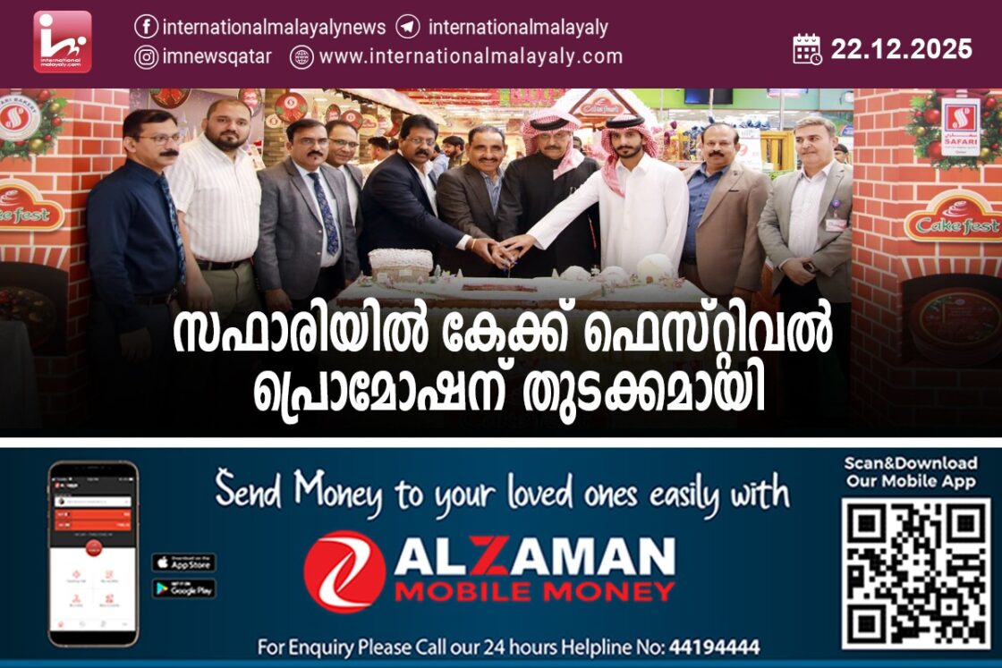 ദോഹ. ഖത്തറിലെ പ്രമുഖ റീട്ടെയില് ഹൈപ്പര് മാര്ക്കറ്റ് ഗ്രൂപ്പായ സഫാരിയില് കേക്ക് ഫെസ്റ്റിവല് പ്രമോഷന് തുടക്കമായി. കേക്ക് ഫെസ്റ്റിവലിന്റെ ഭാഗമായി നടന്ന കേക്ക് കട്ടിംഗ് സഫാരി ഗ്രൂപ്പ് ചെയര്മാന് ഹമദ് ദാഫര് അല് അഹ്ബാബി, സഫാരി ഗ്രൂപ്പ് ഡെപ്യൂട്ടി ചെയര്മാനും മാനേജിംഗ് ഡയറക്ടറുമായ സൈനുല് ആബിദീന്, ജനറല് മാനേജര് സുരേന്ദ്രനാഥ് എന്നിവര് ചേര്ന്ന് നിര്വഹിച്ചു. മറ്റു സഫാരി മാനേജ്മെന്റ് പ്രതിനിധികളും ചടങ്ങില് സന്നിഹിതരായിരുന്നു.