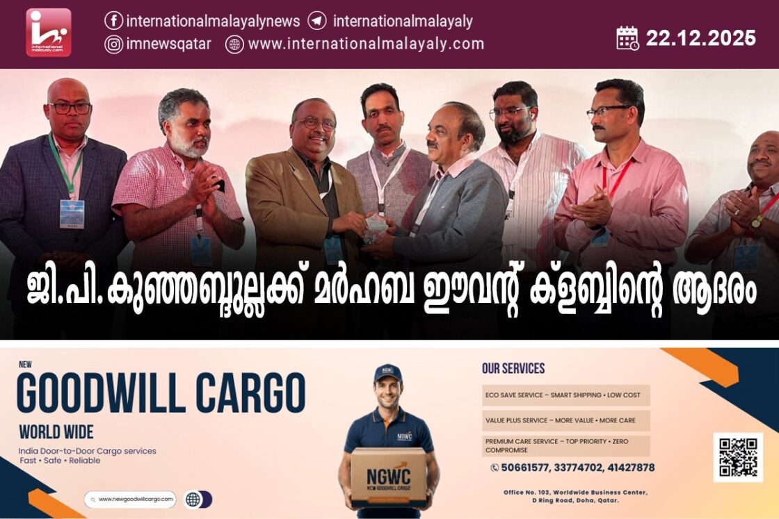 ദോഹ. സര്ഗ സഞ്ചാരത്തിന്റെ വേറിട്ട വഴികളിലൂടെ സഞ്ചരിക്കുന്ന കവിയും സാമൂഹ്യ പ്രവര്ത്തകനുമായ ജി.പി.കുഞ്ഞബ്ദുല്ല ചാലപ്പുറത്തിന് മര്ഹബ ഈവന്റ് ക്ളബ്ബിന്റെ ആദരം.