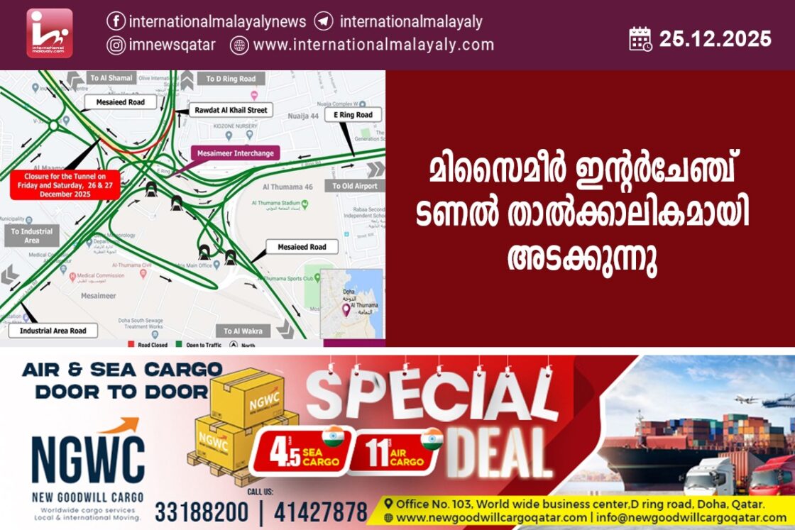 ദോഹ: മിസൈദ് റോഡില് നിന്ന് റൗദത്ത് അല് ഖൈല് സ്ട്രീറ്റിലേക്കുള്ള മിസൈമീര് ഇന്റര്ചേഞ്ച് ടണല് താല്ക്കാലികമായി അടക്കുന്നു