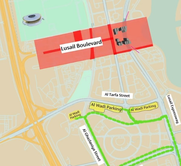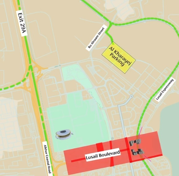 അതേസമയം, വെസ്റ്റ് ദോഹയില് നിന്ന് വരുന്ന സന്ദര്ശകര്ക്ക് അല് ഖോര് കോസ്റ്റല് റോഡില് നിന്ന് എക്സിറ്റ് 29A വഴി മഞ്ഞ പ്രദേശങ്ങളിലെ അല് ഖരായേജ് പാര്ക്കിംഗ് ഉപയോഗിക്കാനും തുടര്ന്ന് ലുസൈല് സ്ട്രീറ്റിലൂടെയുള്ള ദിശാസൂചന അടയാളങ്ങള് പിന്തുടരാനും നിര്ദ്ദേശിക്കുന്നു. (താഴെയുള്ള മാപ്പ് കാണുക)