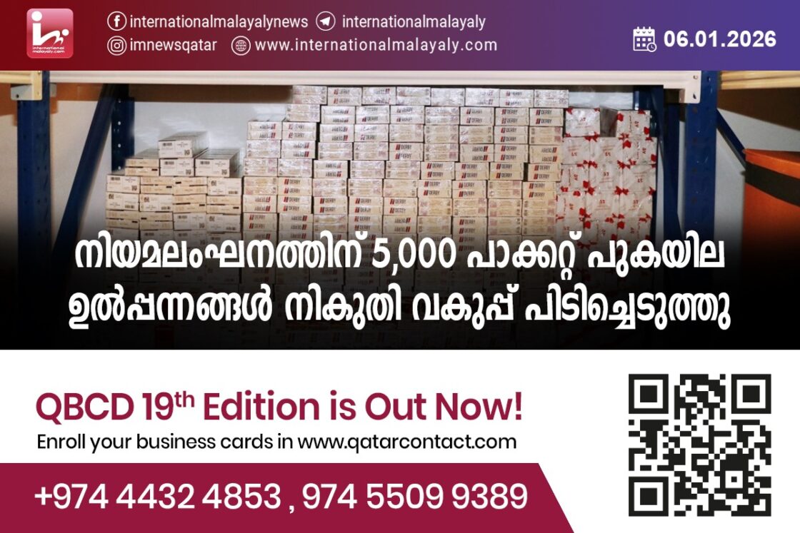 ദോഹ: എക്സൈസ് നികുതി നിയമം ലംഘിച്ചതായി കണ്ടെത്തിയ 5,000 പായ്ക്കറ്റ് പുകയില ഉല്പ്പന്നങ്ങള് നികുതി വകുപ്പ് പിടിച്ചെടുത്തു