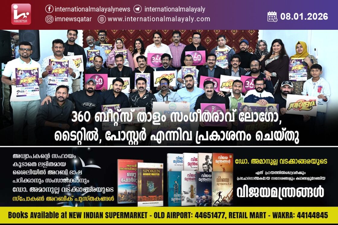 360 ബീറ്റ്സിന്റെ ലോഗോ പ്രകാശനം ഐസിബിഎഫ് ലീഗല് സെല് ചെയര്മാന് അഡ്വക്കേറ്റ് ജാഫര് ഖാന്, ദോഹയിലെ സംഗീതസ്വാദകര്ക്കിടയില് തിളങ്ങി നില്ക്കുന്ന ഡോക്ടര് റഷീദ് പട്ടത്ത്, ഈണം ദോഹ ജനറല് സെക്രട്ടറി ഈണം മുസ്തഫ എന്നിവര് ചേര്ന്നും നിര്വഹിച്ചു.