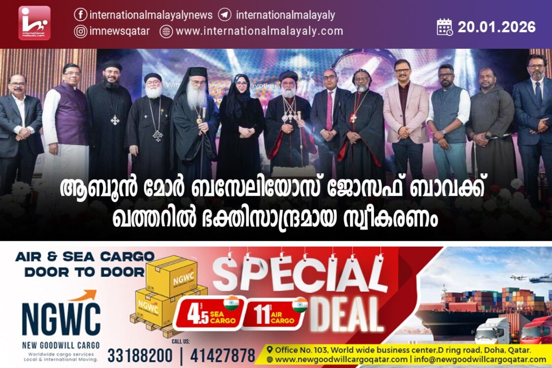 ദോഹ. യാക്കോബായ സുറിയാനി ക്രിസ്ത്യന് സഭയുടെ കാതോലിക്ക അഭിവന്ദ്യ ആബൂന് മോര് ബസേലിയോസ് ജോസഫ് ബാവക്ക് ഖത്തറില് ഭക്തിസാന്ദ്രമായ സ്വീകരണം നല്കി. ദോഹയിലെ സെന്റ് ജെയിംസ് യാക്കോബായ സുറിയാനി ഓര്ത്തഡോക്സ് പള്ളി, കോപ്റ്റിക്, എത്യോപ്യന്, മറ്റ് ഓറിയന്റല് ഓര്ത്തഡോക്സ് സഭകള്, ഗ്രീക്ക് , കത്തോലിക്കാസഭ, മറ്റു ക്രൈസ്തവ സഭകള് എന്നിവയുടെ സഹകരണത്തോടെയും ഖത്തറിലെ മലയാളി സമൂഹത്തിന്റെ പങ്കാളിത്തത്തോടെയുമാണ് പരിപാടി സംഘടിപ്പിച്ചത്.
