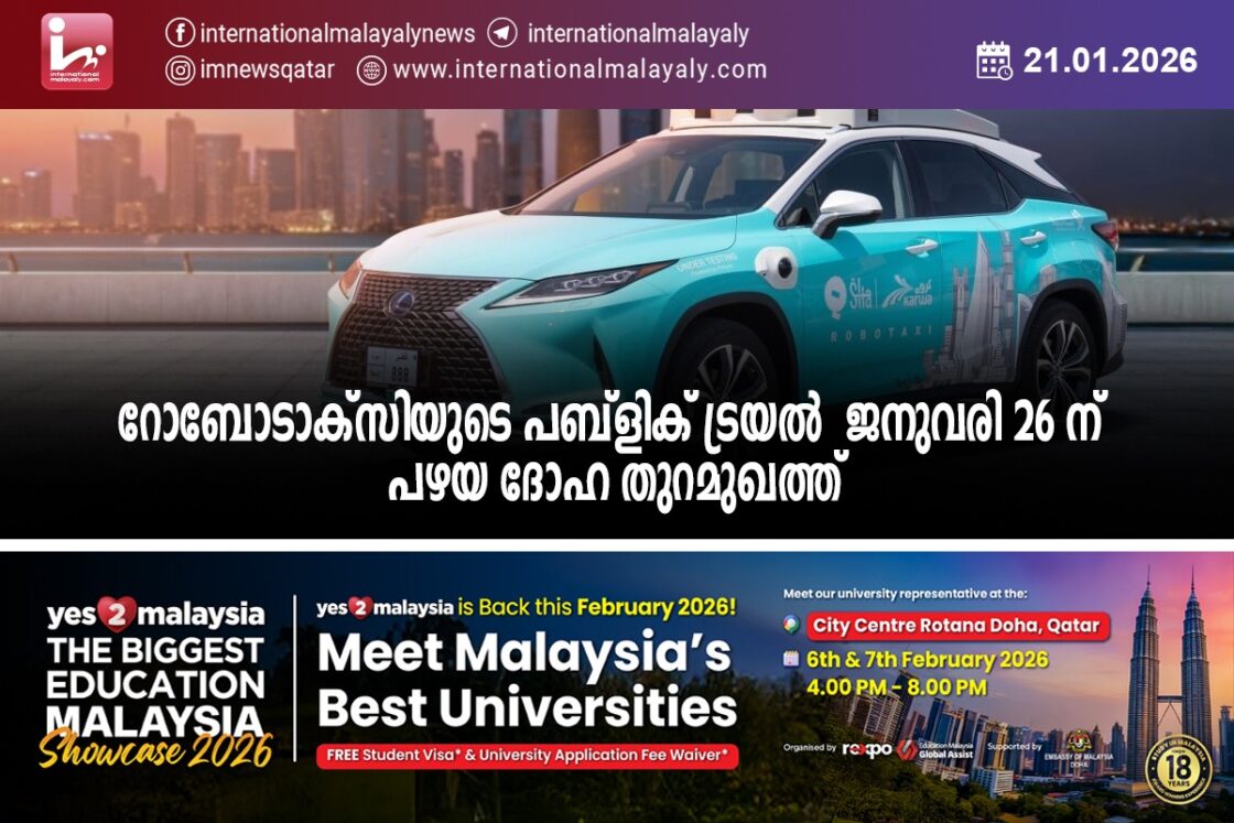 ദോഹ: മൊവാസലാത്ത് (കര്വ) തങ്ങളുടെ പുതിയ റോബോടാക്സിയുടെ പബ്ളിക് ട്രയല് 2026 ജനുവരി 26 തിങ്കളാഴ്ച രാവിലെ 10 മുതല് വൈകുന്നേരം 4 വരെ പഴയ ദോഹ തുറമുഖത്ത് നടത്തും.