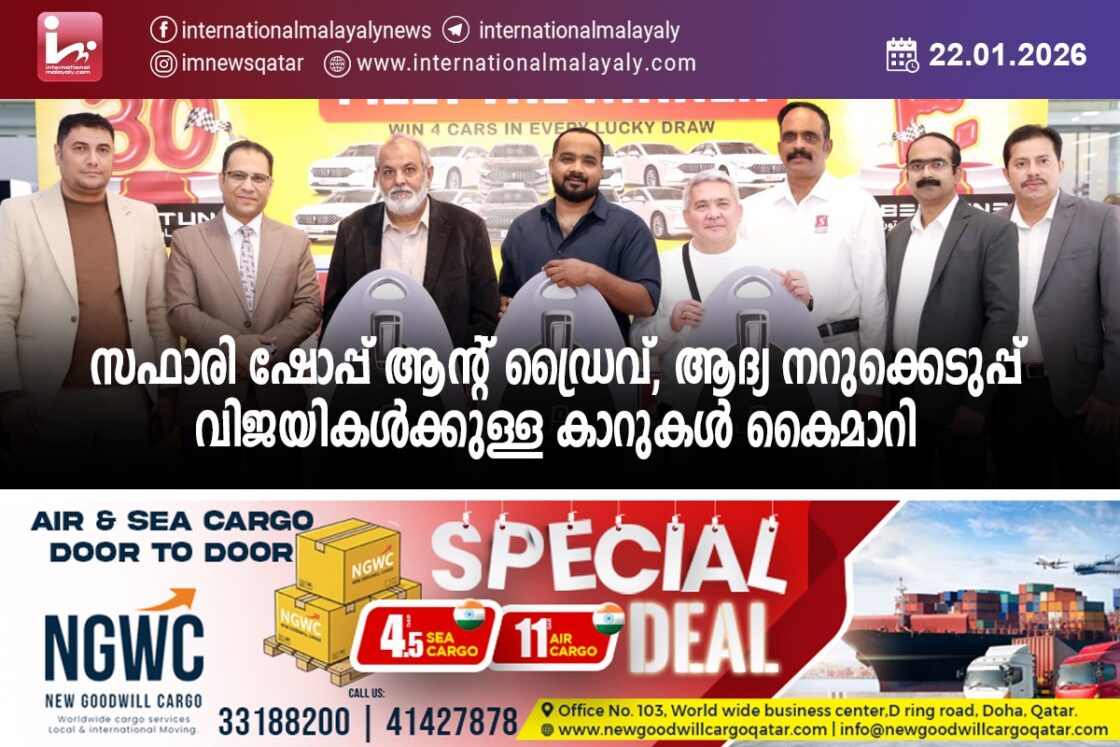 ദോഹ. ഖത്തറിലെ പ്രമുഖ ഹൈപ്പര്മാര്ക്കറ്റ് ശൃംഖലയായ സഫാരി ഹൈപ്പര്മാര്ക്കറ്റിന്റെ മെഗാ പ്രമോഷനായ ഷോപ്പ് ആന്റ് ഡ്രൈവ്, വിന് 30 ബെസ്റ്റൂണ് കാര്സ് മെഗാ പ്രമോഷന്റെ ആദ്യ നറുക്കെടുപ്പിലെ വിജയികള്ക്കുള്ള ബെസ്റ്റിയൂണ് കാറുകള് കൈമാറി.