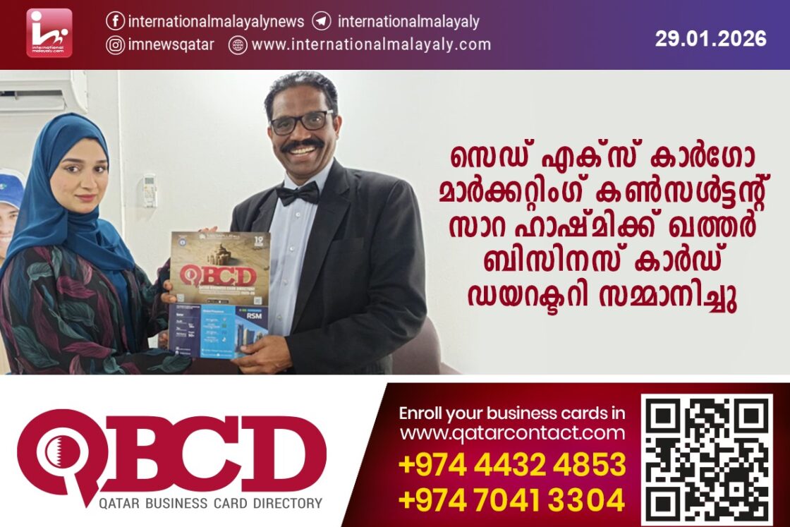ദോഹ. സെഡ് എക്സ് കാര്ഗോ മാര്ക്കറ്റിംഗ് കണ്സല്ട്ടന്റ് സാറ ഹാഷ്മിക്ക് ഖത്തര് ബിസിനസ് കാര്ഡ് ഡയറക്ടറി സമ്മാനിച്ചു. സെഡ് എക്സ് കാര്ഗോ ഓഫീസിലെത്തി ഡയറക്ടറി ചീഫ് എഡിറ്ററും മീഡിയ പ്ളസ് സിഇഒ യുമായ ഡോ.അമാനുല്ല വടക്കാങ്ങരയാണ് ഖത്തര് ബിസിനസ് കാര്ഡ് ഡയറക്ടറിയുടെ പത്തൊമ്പതാമത് പതിപ്പ് സമ്മാനിച്ചത്.