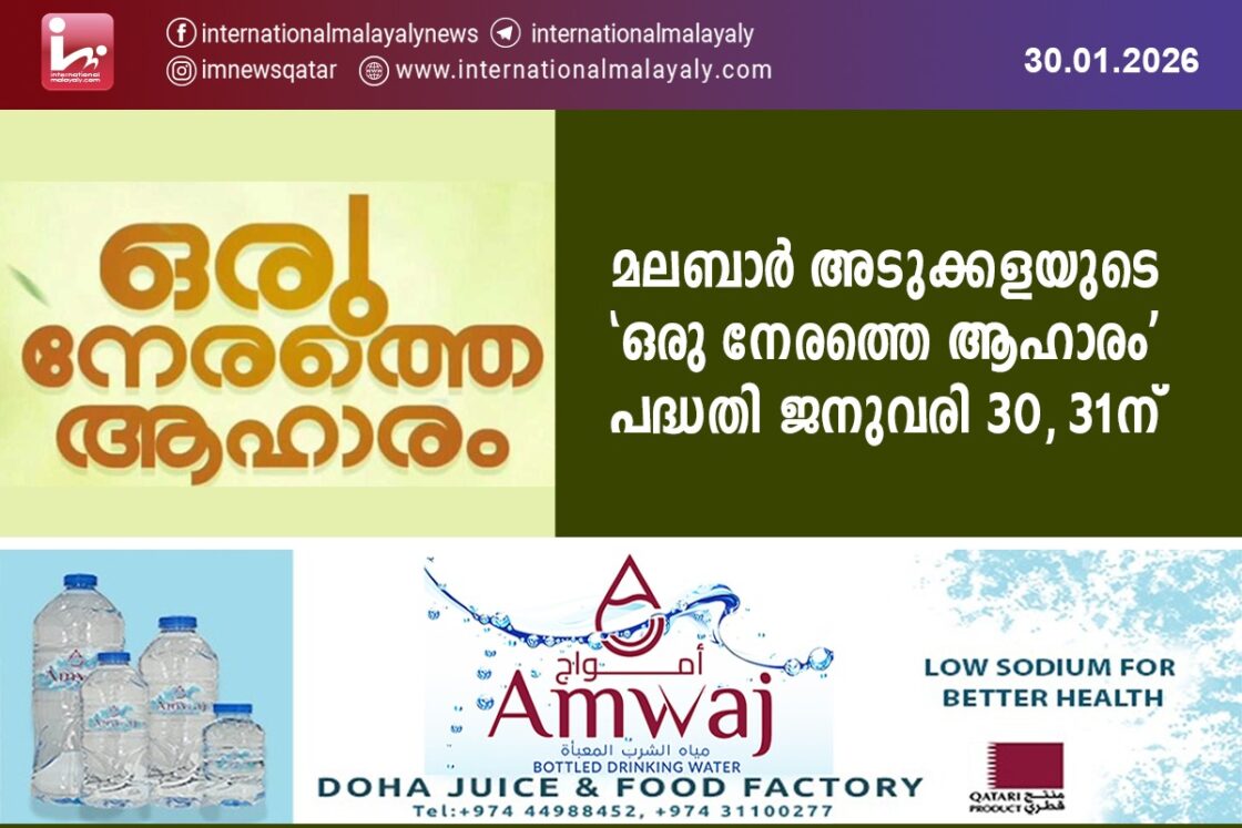 ദോഹ. മലബാര്‍ അടുക്കളയുടെ നേതൃത്വത്തില്‍ പാവപ്പെട്ടവര്‍ക്കായി സംഘടിപ്പിക്കുന്ന ‘ഒരു നേരത്തെ ആഹാരം’ എന്ന മനുഷ്യസ്‌നേഹപരമായ പദ്ധതി ജനുവരി 30, 31 (വെള്ളി, ശനി) ദിവസങ്ങളില്‍ വിവിധ സ്ഥലങ്ങളിലായി നടപ്പാക്കുമെന്ന് സംഘാടകര്‍ അറിയിച്ചു. വിശപ്പില്ലാത്ത ലോകത്തിലേക്കുള്ള പ്രത്യാശയുടെ ചുവടുവെപ്പായാണ് ഈ സംരംഭം.