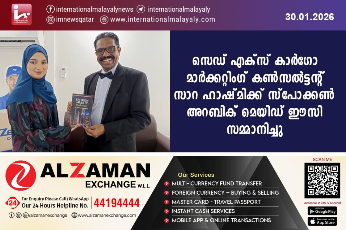 സെഡ് എക്സ് കാര്ഗോ മാര്ക്കറ്റിംഗ് കണ്സല്ട്ടന്റ് സാറ ഹാഷ്മിക്ക് സ്പോക്കണ് അറബിക് മെയിഡ് ഈസി സമ്മാനിച്ചു