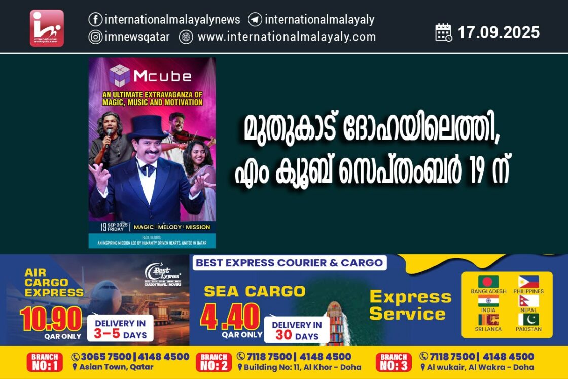 ദോഹ. മാജികും സംഗീതവും മോട്ടിവേഷനും സമന്വയിപ്പിച്ച് പ്രശസ്ത മാന്ത്രികനും സാമൂഹ്യ പ്രവര്ത്തകനുമായ ഗോപിനാഥ് മുതുകാടും സംഘവും അവതരിപ്പിക്കുന്ന എം ക്യൂബ് സെപ്തംബര് 19 ന് ദോഹ മോഡേണ് ഇന്ത്യന് സ്കൂള് ഓഡിറ്റോറിയത്തില് നടക്കും.
