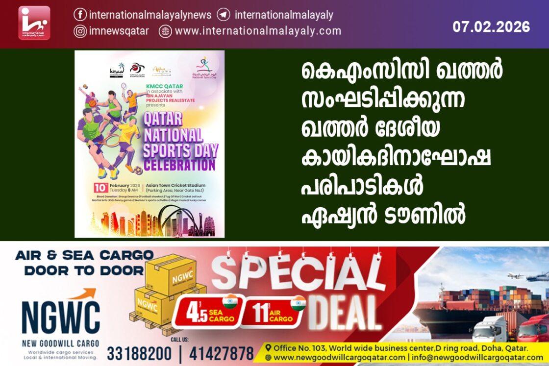 എന്ന പ്രമേയത്തിൽ സംഘടിപ്പിക്കപ്പെടുന്ന ഈ വർഷത്തെ ഖത്തർ ദേശീയ കായിക ദിനത്തിന്റെ ഭാഗമായി ഫെബ്രുവരി 10 ന് ചൊവ്വ വിപുലമായ പരിപാടികളോടെ കെഎംസിസി ഖത്തർ സംസ്ഥാന കമ്മിറ്റിയുടെ നേതൃത്വത്തിൽ കായികദിനാഘോഷം സംഘടിപ്പിക്കാൻ തീരുമാനിച്ചു . സംസ്ഥാന ഭാരവാഹികൾ ഉപദേശക സമിതി അംഗങ്ങൾ മുതിർന്ന നേതാക്കൾ ജില്ലാ ഭാരവാഹികളുടെ സംയുക്ത സംഗമത്തിൽ പരിപാടി വിജയിപ്പിക്കുന്നതിന് ആവശ്യമായ പ്രവർത്തനങ്ങൾക്ക് രൂപം നൽകി . ഐ ബി എൻ അജ്യാൻ ഗ്രൂപ്പുമായി സഹകരിച്ചാണ് ഇൻഡസ്ട്രിയൽ ഏരിയ യിലെ ഏഷ്യൻ ടൌൺ ക്രിക്കറ്റ് സ്റ്റേഡിയത്തിന് മുൻവശത്തെ ഗ്രൗണ്ടിലാണ് പരിപാടിസംഘടിപ്പിക്കുന്നത് . ഖത്തറിലെ ഇന്ത്യൻ കമ്മ്യൂണിറ്റി നേതാക്കൾ സാംസ്കാരിക സംഘടന നേതാക്കൾ പ്രമുഖ വ്യക്തിത്വങ്ങൾ അതിഥികളായി സംബന്ധിക്കും . വിവിധ ഘടകങ്ങയുടെ നേതൃത്വത്തിൽ