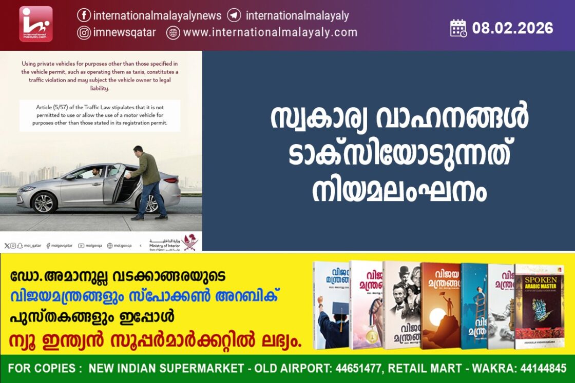 ദോഹ. സ്വകാര്യ വാഹനങ്ങള് സ്വന്തം ആവശ്യങ്ങള്ക്ക് വേണ്ടി മാത്രമുള്ളതാണെന്നും ടാക്സിയോടുന്നത് വ്യക്തമായ നിയമലംഘനമാണെന്നും ആഭ്യന്തര മന്ത്രാലയം വ്യക്തമാക്കി. പിടിക്കപ്പെട്ടാല് കനത്ത ശിക്ഷ ലഭിക്കും