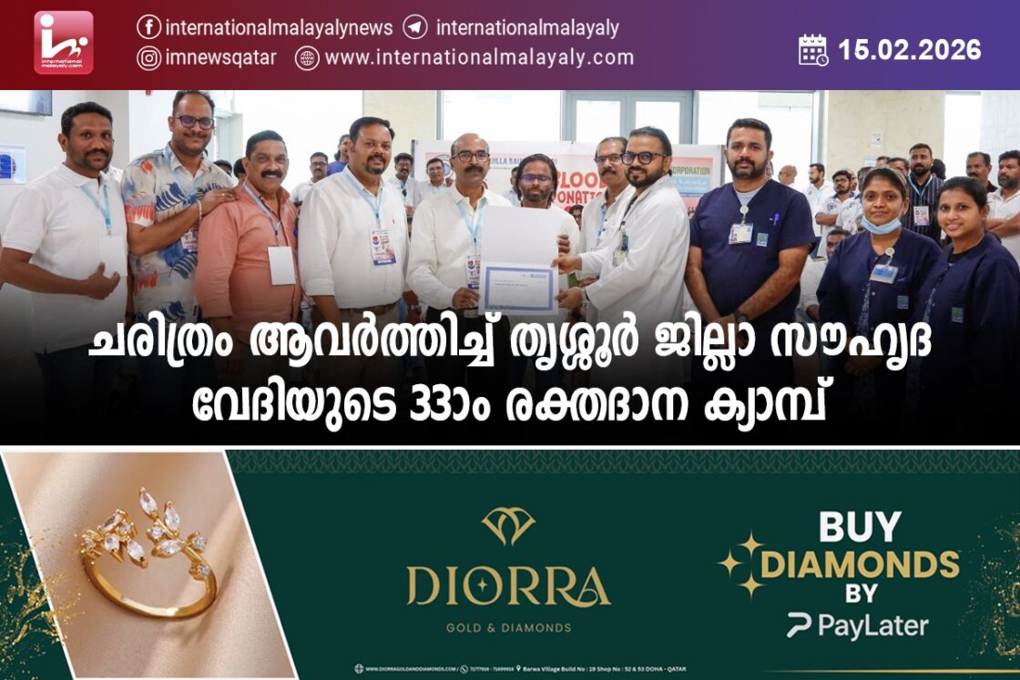 ദോഹ. ഇന്ത്യന് റിപ്പബ്ലിക് ദിന ആഘോഷത്തിന്റെ ഭാഗമായി തൃശ്ശൂര് ജില്ലാ സൗഹൃദ വേദി സംഘടിപ്പിച്ച 33-ാമത് രക്തദാന ക്യാമ്പ് 13-02-2026 വെള്ളിയാഴ്ച രാവിലെ 7.00 മുതല് വൈകിട്ട് 3.30 വരെ ഹമദ് ഖത്തര് നാഷണല് ബ്ലഡ് ഡൊണേഷന് സെന്ററില് വിജയകരമായി നടന്നു.