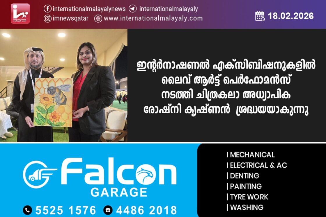 ദോഹ: ഖത്തറിലെ സാംസ്കാരിക വേദികളില് തന്റെ കലാസാന്നിധ്യം ഉറപ്പിച്ച് മുന്നേറുന്ന രോഷ്നി കൃഷ്ണന്റെ ലൈവ് ആര്ട്ട് ജീവിത്തത്തിലെ പ്രത്യേക നാഴികക്കല്ലുകളാണ് ഇന്റര്നാഷണല് എക്സിബിഷനുകളിലെയും വിവിധ ഫെസ്റ്റിവല് സീസണിനോടനുബന്ധിച്ച് സംഘടിപ്പിക്കുന്ന ഫെസ്റ്റുകളിലെയും ലൈവ് ആര്ട്ട് പെര്ഫോമന്സുകള്. ദോഹയിലെ മന്ത്രലായ തലങ്ങളിലുള്ള പ്രമുഖ ആഘോഷവേദികളില് ശ്രദ്ധ നേടിക്കൊണ്ട് അതത് ഫെസ്റ്റുകളുടെ ആത്മാവും സംസ്കാരപരമായ പ്രത്യേകതകളും നിറഞ്ഞുനില്ക്കുന്ന ചിത്രങ്ങളാണ് റോഷ്നി ടീച്ചര് മിനിറ്റുകള് കൊണ്ട് വരച്ചു തീര്ക്കുന്നത്.