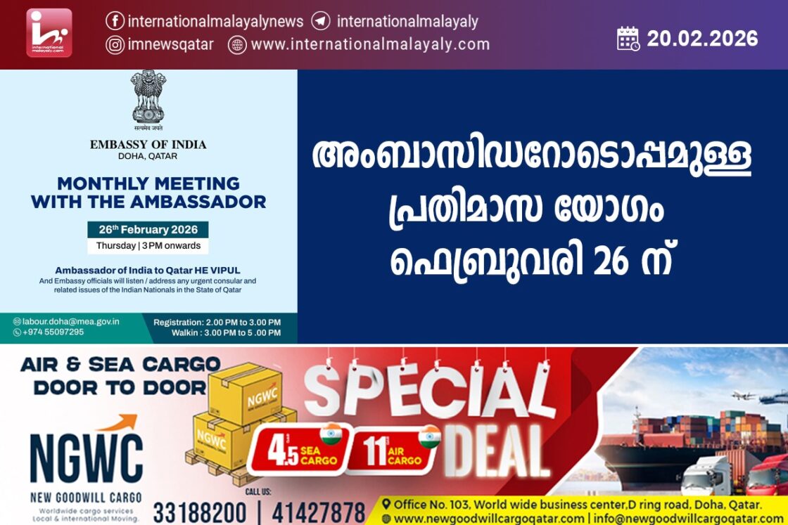 ദോഹ. ഖത്തറിലെ ഇന്ത്യക്കാരുടെ പ്രശ്നങ്ങള് കേള്ക്കുന്നതിനും സാധ്യമായ പരിഹാര നടപടികള് നിര്ദേശിക്കുന്നതിനുമായി മാസം തോറും നടക്കാറുള്ള അംബാസിഡറോടൊപ്പമുള്ള പ്രതിമാസ യോഗം ഫെബ്രുവരി 26 ന് വ്യാഴാഴ്ച നടക്കും. ഇന്ത്യന് അംബാസിഡര് വിപുല് ഓപണ് ഹൗസിന് നേതൃത്വം നല്കും. ഉച്ചയ്ക്ക് ശേഷം 2 മണി മുതല് 3 മണി വരെ രജിസ്ട്രേഷനായിരിക്കും. 3 മണി മുതല് 5 മണി വരെ എംബസിയില് നേരിട്ട് ഹാജരായി ഓപണ് ഹൗസില് പങ്കെടുക്കാം. കൂടുതല് വിവരങ്ങള്ക്ക് 55097295 എന്ന നമ്പറില് ബന്ധപ്പെടാം. ഓപണ് ഹൗസില് പങ്കെടുക്കാന് താല്പര്യപ്പെടുന്നവര് [email protected] എന്ന ഇമെയിലിലേക്ക് അപേക്ഷകള് അയക്കുകയും ചെയ്യാം.