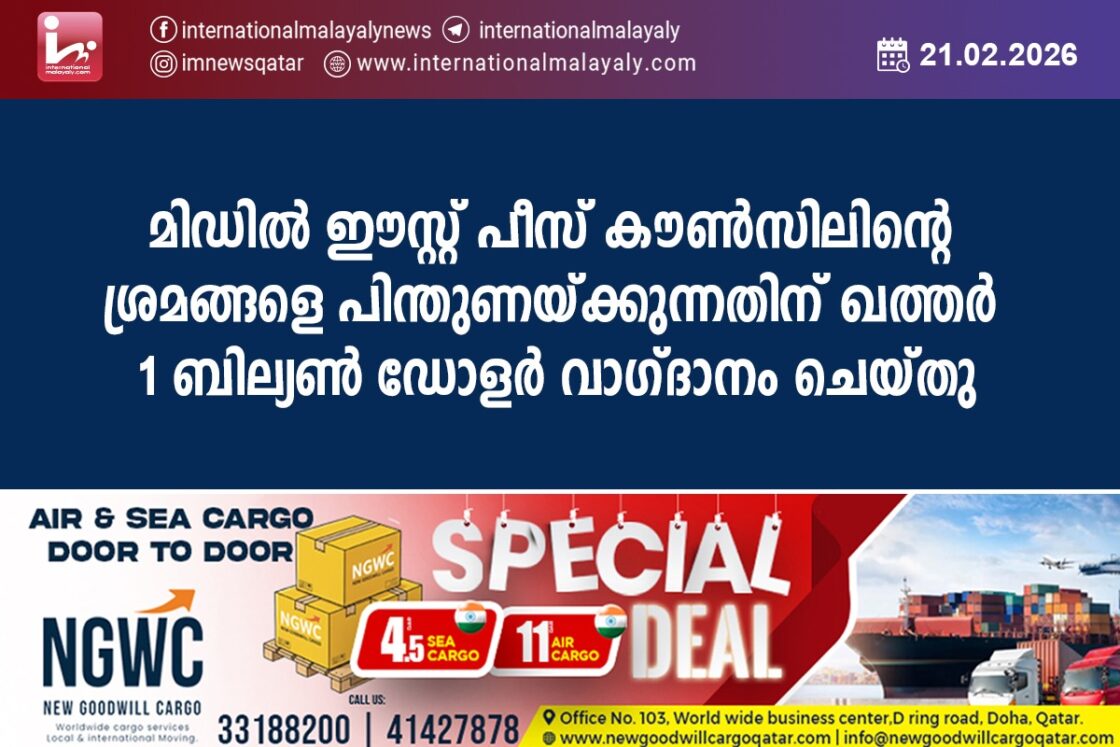 മിഡില് ഈസ്റ്റ് പീസ് കൗണ്സിലിന്റെ ശ്രമങ്ങളെ പിന്തുണയ്ക്കുന്നതിന് ഖത്തര് 1 ബില്യണ് ഡോളര് വാഗ്ദാനം ചെയ്തു