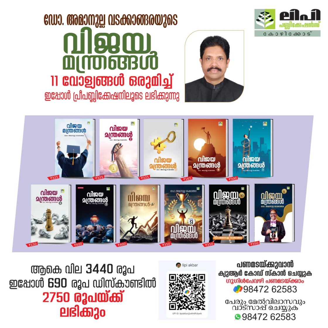 Published by India-based LIPI Publication, Vijayamanthrangal Part 11 marks the 101st book authored by Dr. Amanulla Vadakkangara, a significant milestone in his literary and motivational journey.