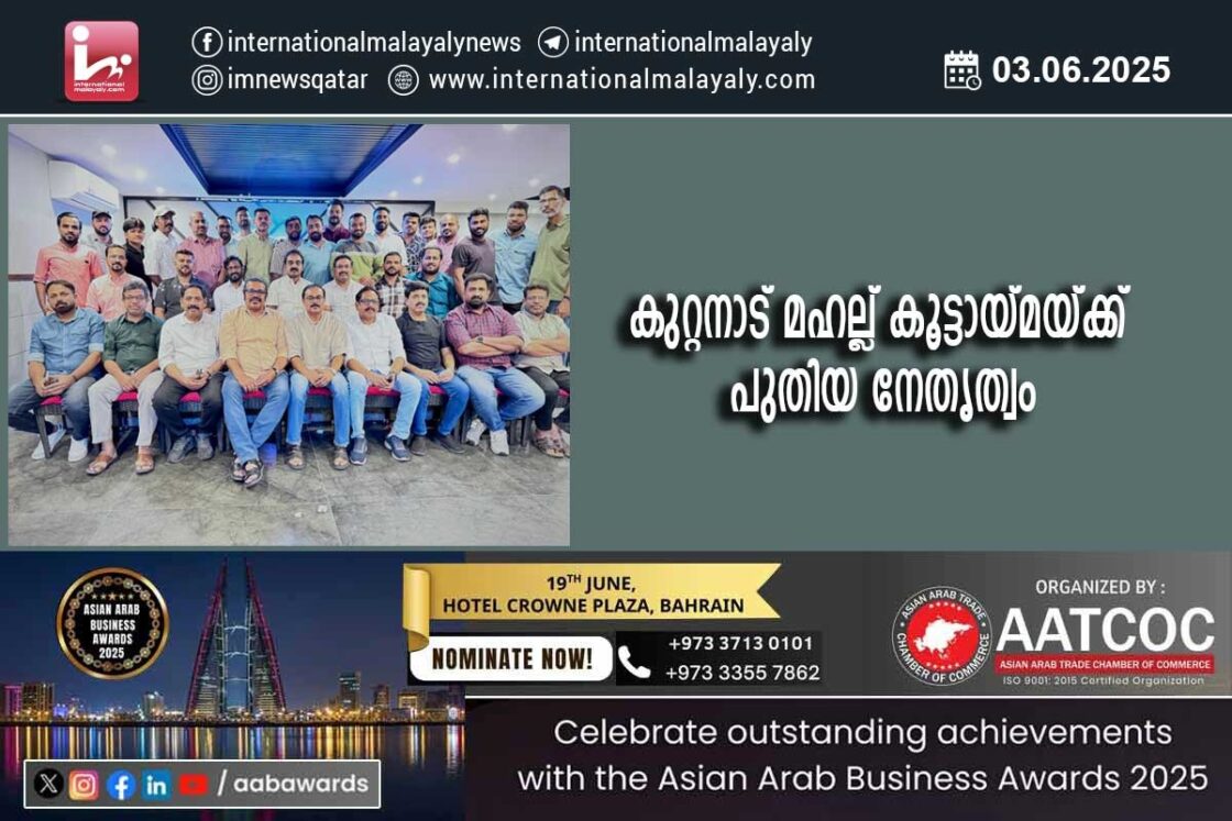 ദോഹ : പാലക്കാട് ജില്ലയിലെ കൂറ്റനാട് മഹല്ല് നിവാസികളുടെ കൂട്ടായ്മയായ ഖത്തര് കൂറ്റനാട് മഹല്ല് കൂട്ടായ്മയ്ക്ക് പുതിയ ഭാരവാഹികള്.ബഷീര് കെ വി( ചെയര്മാന്) എ വി അബ്ദുല് ജലീല് (പ്രസിഡണ്ട്) , അഷ്റഫ് പി എ നാസര് (ജനറല് സെക്രട്ടറി) കബീര് കെ.വി ( ട്രഷറര്), ഷാജി എ.വി, സകീര്. വി.പി. ( വൈസ് പ്രസിഡണ്ട് മാര് ), ശിഹാബ് (ജോയിന്റ് ട്രഷറര്) ശറഫുദ്ധീന്, ഷൌക്കത്ത് (ജോയിന്റ് സെക്രട്ടറി) എന്നിവരെ പുതിയ ഭാരവാഹികളായി തെരഞ്ഞെടുത്തു.