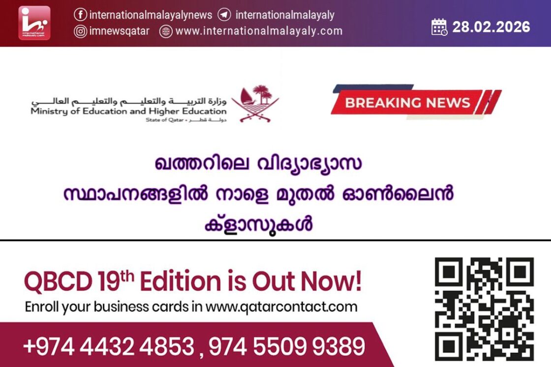 ദോഹ. മേഖലയിലെ സംഘര്ഷാവസ്ഥ കണക്കിലെടുത്ത് ഖത്തറിലെ വിദ്യാഭ്യാസ സ്ഥാപനങ്ങളില് നാളെ മുതല് ഇനിയൊരറിയിപ്പുണ്ടാകുന്നതുവരെ ഓണ് ലൈന് ക്ളാസുകളായിരിക്കുമെന്ന് വിദ്യാഭ്യാസ ഉന്നത വിദ്യാഭ്യാസ മന്ത്രാലയം അറിയിച്ചു.