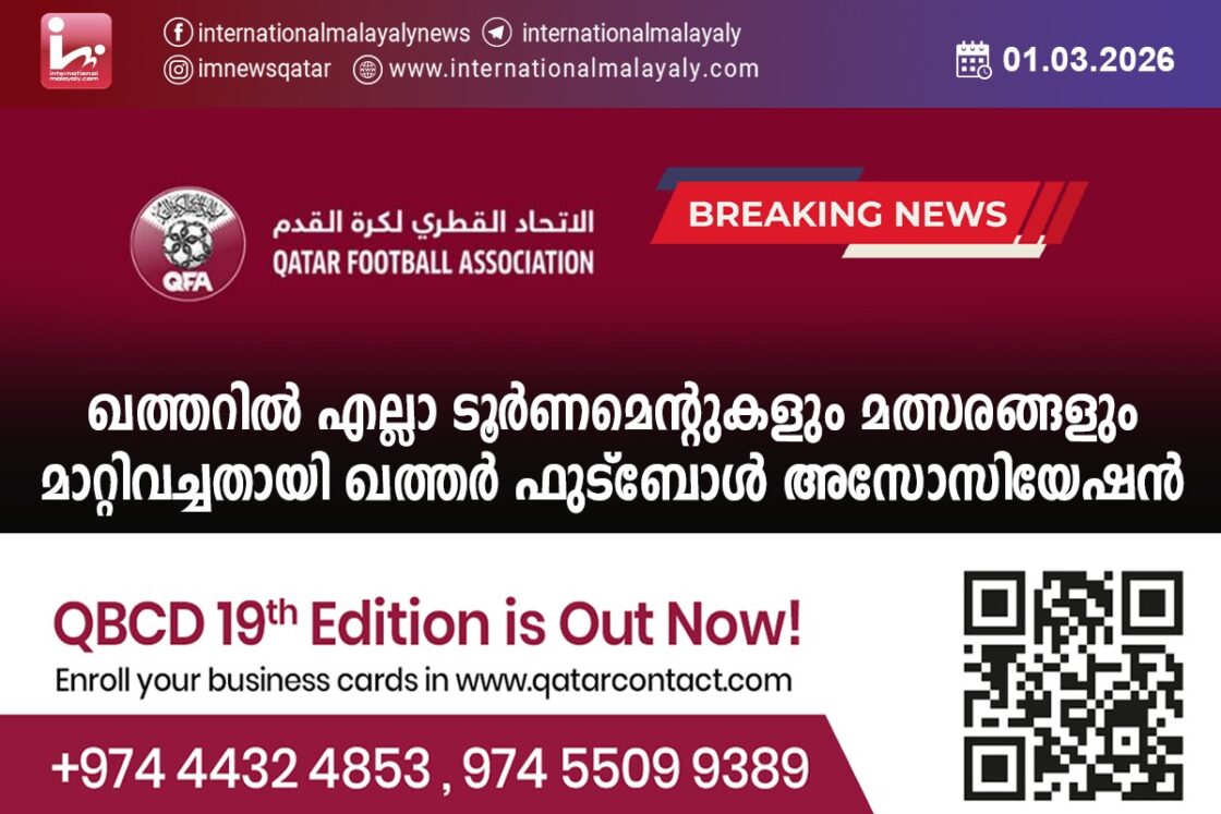 ഖത്തറില് എല്ലാ ടൂര്ണമെന്റുകളും മത്സരങ്ങളും മാറ്റിവച്ചതായി ഖത്തര് ഫുട്ബോള് അസോസിയേഷന്