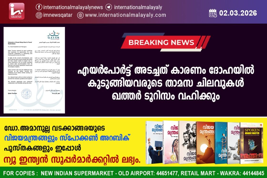 ദോഹ. മേഖലയിലെ സംഘര്ഷത്തെ തുടര്ന്ന് എയര്പോര്ട്ട് അടച്ചത് കാരണം ദോഹയില് കുടുങ്ങിയവരുടെ താമസ ചിലവുകള് ഖത്തര് ടൂറിസം വഹിക്കും. എയര്പോര്ട്ട് തുറക്കുന്നത് വരെ ഖത്തറിലെ വിവിധ ഹോട്ടലുകളില് താമസിക്കുന്നവരുടെ താമസം നീട്ടികൊടുക്കണമെന്നും ഫെബ്രുവരി 28 ന് ശേഷമുള്ള അധിക ചിലവുകള് ഖത്തര് ടൂറിസം വഹിക്കുമെന്നും ഹോട്ടലധികൃതര്ക്ക് അയച്ച കത്തില് വ്യക്തമാക്കി.