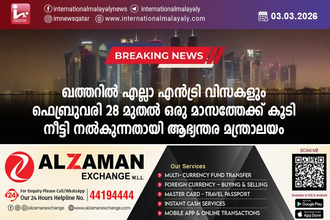 ദോഹ. കാലാവധി കഴിഞ്ഞതോ അല്ലെങ്കില്‍ ഉടന്‍ അവസാനിക്കാറായതോ ആയ എല്ലാ വിഭാഗത്തിലുള്ള എന്‍ട്രി വിസകളും, 2026 ഫെബ്രുവരി 28 ശനിയാഴ്ച മുതല്‍ പ്രാബല്യത്തില്‍ വരുന്ന രീതിയില്‍ ഒരു മാസത്തേക്ക് കൂടി നീട്ടി നല്‍കുന്നതായി ആഭ്യന്തര മന്ത്രാലയം അറിയിക്കുന്നു. സാഹചര്യങ്ങള്‍ക്കനുസരിച്ച് ഇത് ഇനിയും നീട്ടി നല്‍കിയേക്കാം.