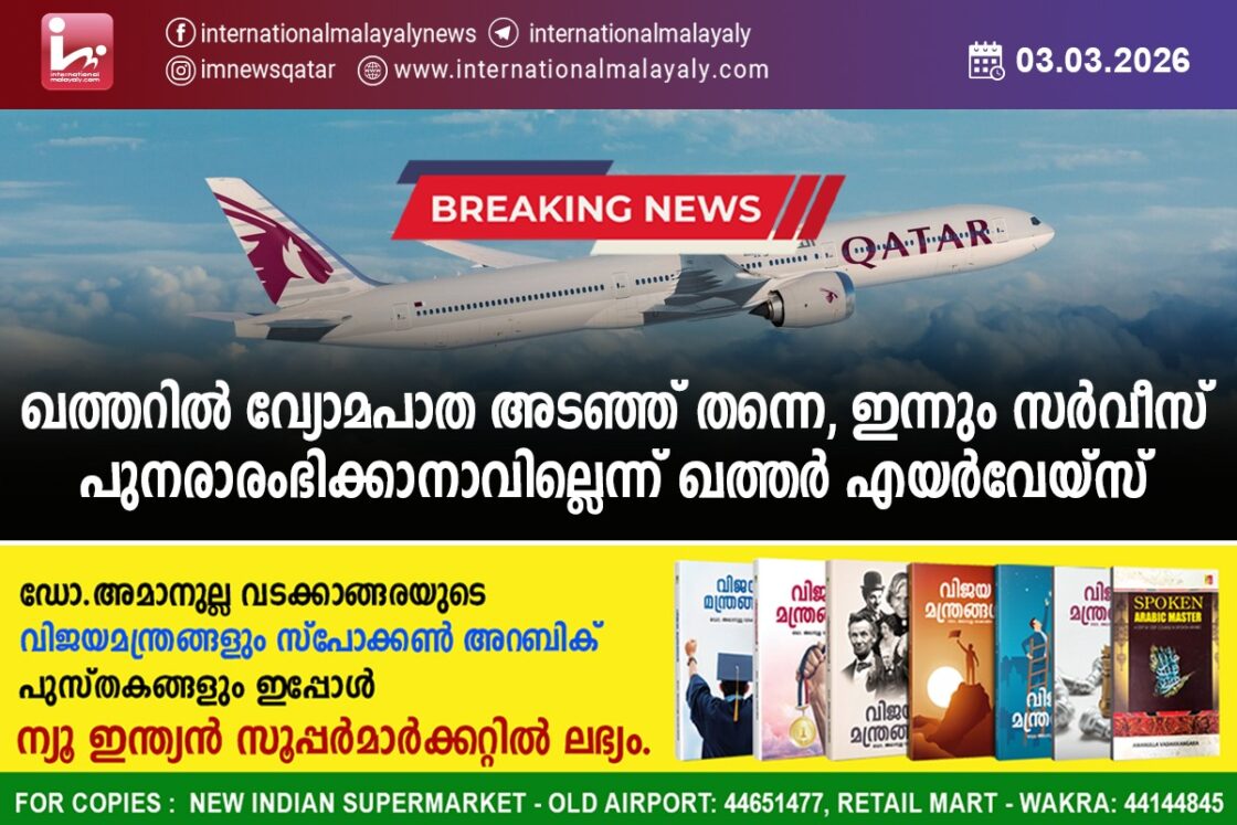 ഖത്തറില് വ്യോമപാത അടഞ്ഞ് തന്നെ ,ഇന്നും സര്വീസ് പുനരാരംഭിക്കാനാവില്ലെന്ന് ഖത്തര് എയര്വേയ്സ്