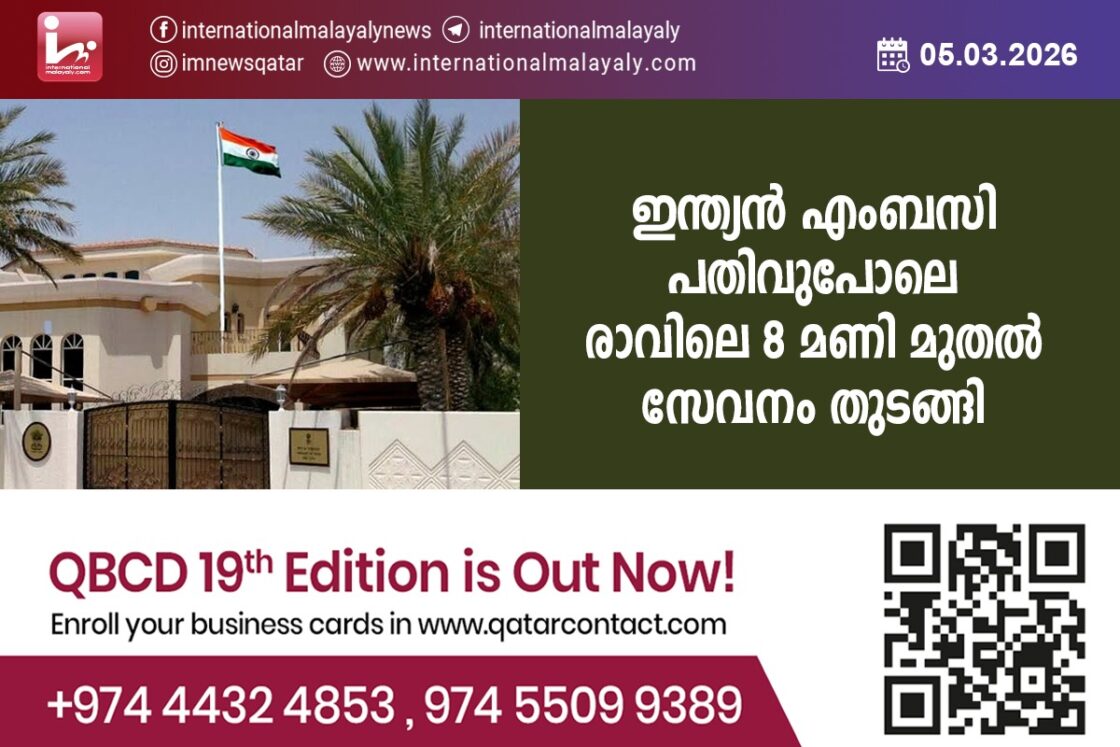 ദോഹ. ഖത്തറിലെ ഇന്ത്യന് എംബസി പതിവുപോലെ രാവിലെ 8 മണി മുതല് സേവനം തുടങ്ങിയതായി എംബസി സോഷ്യല് മീഡിയയിലൂടെ അറിയിച്ചു
