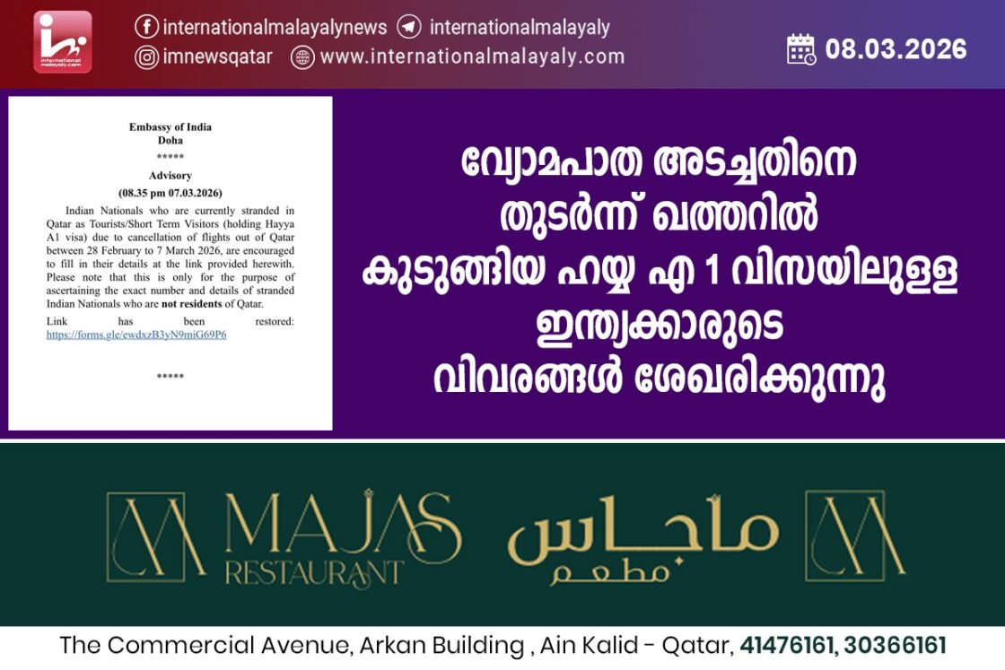 വ്യോമപാത അടച്ചതിനെ തുടര്ന്ന് ഖത്തറില് കുടുങ്ങിയ ഹയ്യ എ 1 വിസയിലുളള ഇന്ത്യക്കാരുടെ വിവരങ്ങള് ശേഖരിക്കുന്നു