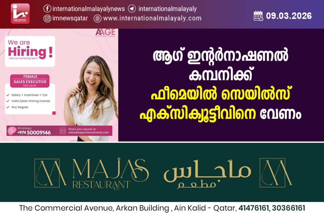 ദോഹ. ഖത്തറിലെ പ്രമുഖ ബാറ്ററി വിതരണ കമ്പനിയായ ആഗ് ഇന്റര്നാഷണല് കമ്പനിക്ക് ഫീമെയില് സെയില്സ് എക്സിക്യൂട്ടീവിനെ വേണം. ബിരുദവും ഖത്തര് ഡ്രൈവിംഗ് ലൈസന്സുമുള്ളവര്ക്ക് അപേക്ഷിക്കാം. 50009146 എന്ന വാട്സ് ആപ്പ് നമ്പറിലോ [email protected] എന്ന ഇമെയിലിലോ അപേക്ഷ അയക്കാം.