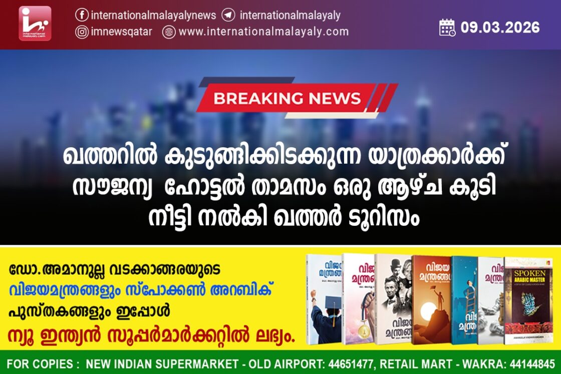 ദോഹ. മേഖലയിലെ സംഘര്‍ഷാവസ്ഥയെത്തുടര്‍ന്ന് വ്യോമപാത അടച്ചതിനാല്‍ ഖത്തറില്‍ കുടുങ്ങിക്കിടക്കുന്ന യാത്രക്കാര്‍ക്ക് സൗജന്യ ഹോട്ടല്‍ താമസം ഒരു ആഴ്ച കൂടി നീട്ടി നല്‍കി ഖത്തര്‍ ടൂറിസം രംഗത്ത്. ഖത്തറിലെ അംഗീകൃത ഹോട്ടലുകളില്‍ മാര്‍ച്ച് 13 വരെയാണ് സൗജന്യ താമസം ഒരുക്കിയിരിക്കുന്നത്.