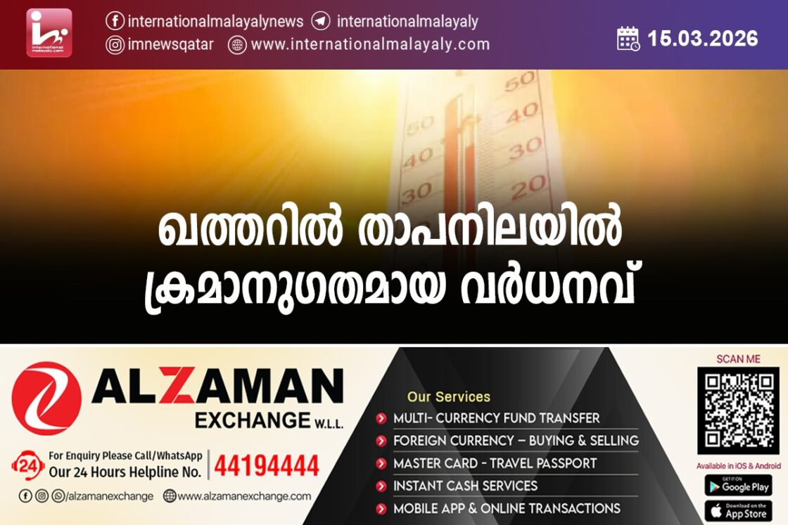 ഖത്തറില്‍ താപനിലയില്‍ ക്രമാനുഗതമായ വര്‍ധനവ് . ഈ വര്‍ദ്ധനവ് വാരാന്ത്യം വരെ തുടരുമെന്നും വാരാന്ത്യത്തില്‍ 30 ഡിഗ്രിവരെയെത്തുമെന്നും കാലാവസ്ഥ നിപീക്ഷണ വകുപ്പ് അറിയിച്ചു