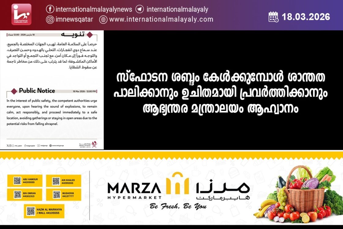 ദോഹ. നിലവിലെ സംഘര്ഷകരമായ അന്തരീക്ഷത്തില് സ്ഫോടന ശബ്ദം കേള്ക്കുമ്പോള് ശാന്തത പാലിക്കാനും ഉചിതമായി പ്രവര്ത്തിക്കാനും ആഭ്യന്തര മന്ത്രാലയം പൊതുജനങ്ങളോട് ആഹ്വാനം ചെയ്തു. പുറത്തുള്ളവര് ഉടനെ തൊട്ടടുത്തുള്ള ബില്ഡിംഗിനുള്ളില് സുരക്ഷിതമായ സ്ഥലത്തേക്ക് നീങ്ങണം.