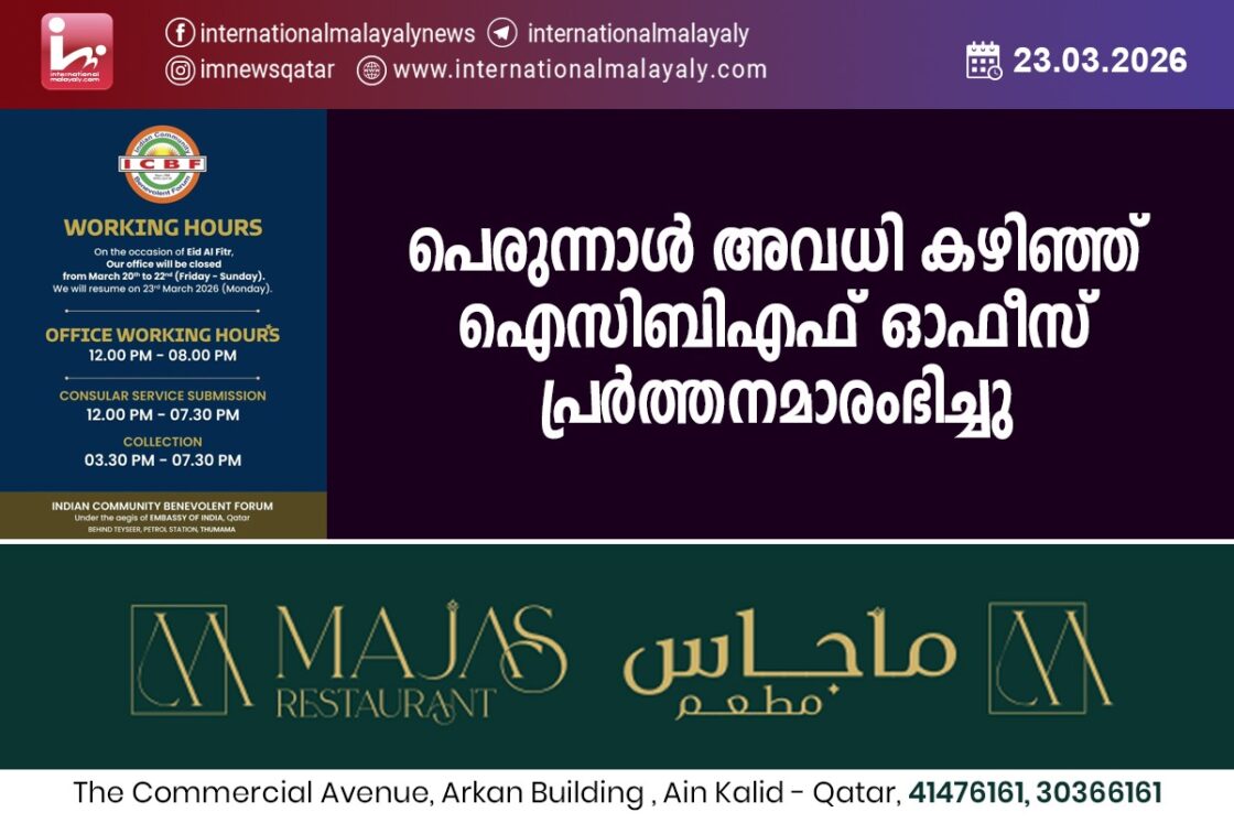 ദോഹ. പെരുന്നാള് അവധി കഴിഞ്ഞ് പെരുന്നാള് അവധി കഴിഞ്ഞ് പ്രവര്ത്തനമാരംഭിച്ചു. ഉച്ചക്ക് 12 മണി മുതല് രാത്രി 8 മണിവരെയാണ് ഓഫീസ് സമയം.