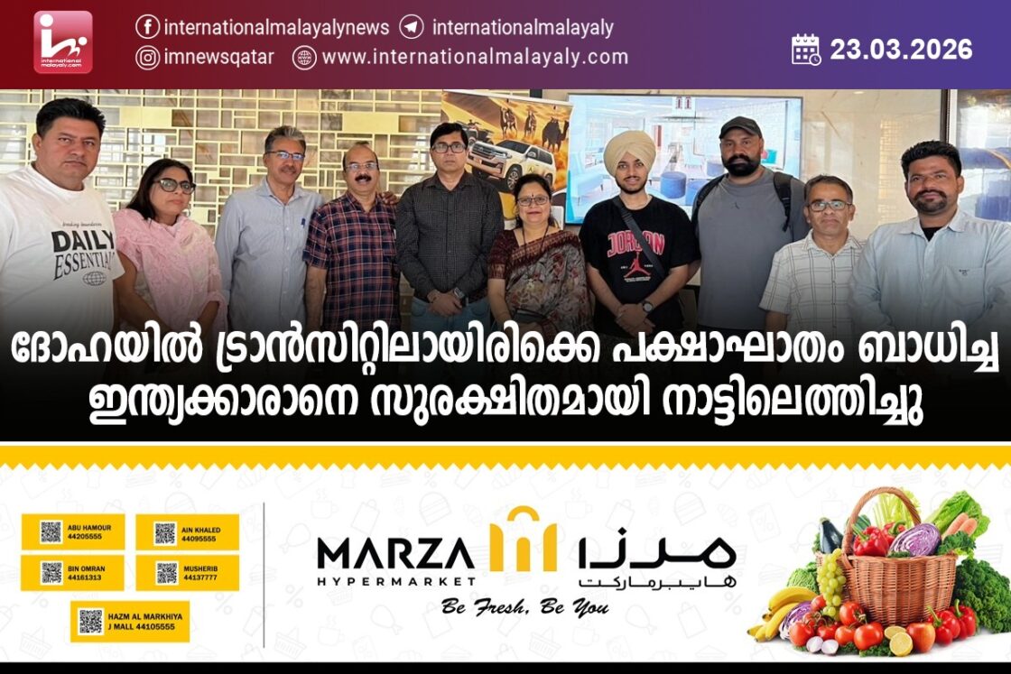 ദോഹയില് ട്രാന്സിറ്റിലായിരിക്കെ പക്ഷാഘാതം ബാധിച്ച ഇന്ത്യക്കാരാനെ സുരക്ഷിതമായി നാട്ടിലെത്തിച്ചു