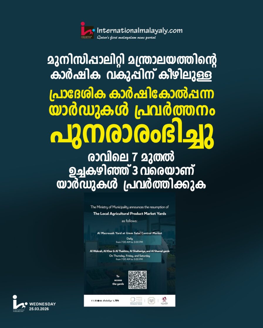 മുനിസിപ്പാലിറ്റി മന്ത്രാലയത്തിന്റെ കാര്ഷിക വകുപ്പിന് കീഴിലുള്ള പ്രാദേശിക കാര്ഷികോല്പ്പന്ന യാര്ഡുകള് പ്രവര്ത്തനം പുനരാരംഭിച്ചു. രാവിലെ 7 മുതല് ഉച്ചകഴിഞ്ഞ് 3 വരെയാണ് യാര്ഡുകള് പ്രവര്ത്തിക്കുക.