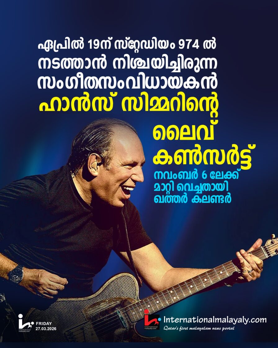 ഏപ്രില് 19 ന് സ്റ്റേഡിയം 974 ല് നടത്താന് നിശ്ചയിച്ചിരുന്ന സംഗീതസംവിധായകന് ഹാന്സ് സിമ്മറിന്റെ ലൈവ് കണ്സര്ട്ട് നവംബര് 6 ലേക്ക് മാറ്റി വെച്ചതായി ഖത്തര് കലണ്ടര് അറിയിച്ചു