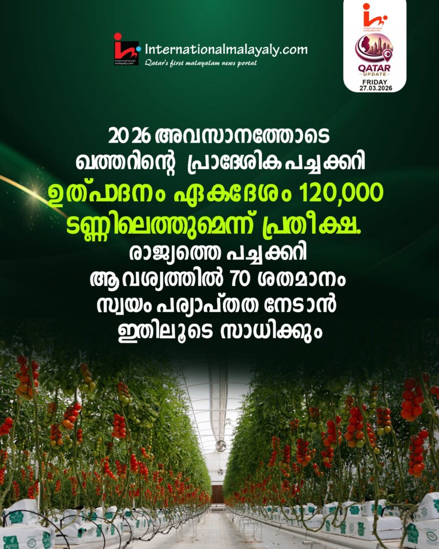 2026 അവസാനത്തോടെ ഖത്തറിന്റെ പ്രാദേശിക പച്ചക്കറി ഉത്പാദനം ഏകദേശം 120,000 ടണ്ണിലെത്തുമെന്ന് പ്രതീക്ഷ. രാജ്യത്തെ പച്ചക്കറി ആവശ്യത്തില് 70 ശതമാനം സ്വയം പര്യാപ്തത നേടാന് ഇതിലൂടെ സാധിക്കും.
